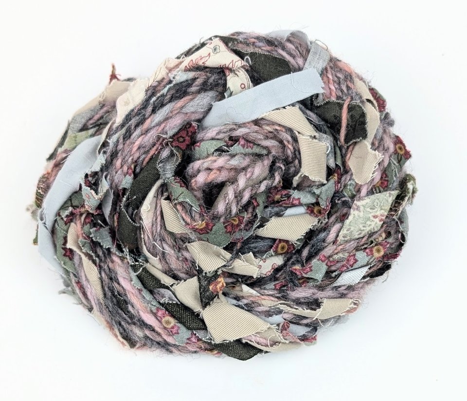 These amazing skeins are spun from a batt of pink and grey wool and wrapped with fabric strips. They are fabulous skeins that would add texture to a woven project or a stunning pop of colour to a wall hanging.