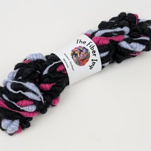 This amazing skein is spun from bright solid colours separated by stripes of black 18.5 micron merino roving and plyed with a white cotton core. This is a two ply thick and thin art yarn that will give your project a very unique striped look. It has been lightly fulled to reduce pilling in the finished item and is a soft, fluffy skein that would be great in next to skin projects.