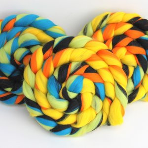 This lovely skein is spun from my custom blended roving on my Schacht Matchless spinning wheel. It has bright shades of green, blue, yellow, orange and black combined with a ply of bright green merino for an intensely bright and fun mix. It is a soft, fluffy skein that would be great for next to skin projects. All of my handspun skeins are truly one of a kind as even skeins made from the same colourway will have a different distribution of colours.