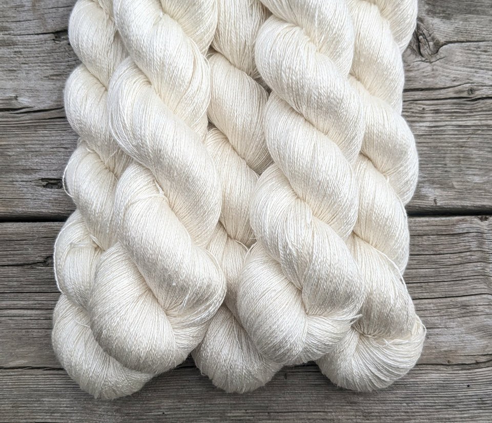 This mulberry silk yarn is very smooth, has a rich sheen and will have a wonderful drape. This yarn works wonderfully for knitting, crocheting and weaving. Use it undyed or combine it with one of our handpainted skeins for a colourwork project.